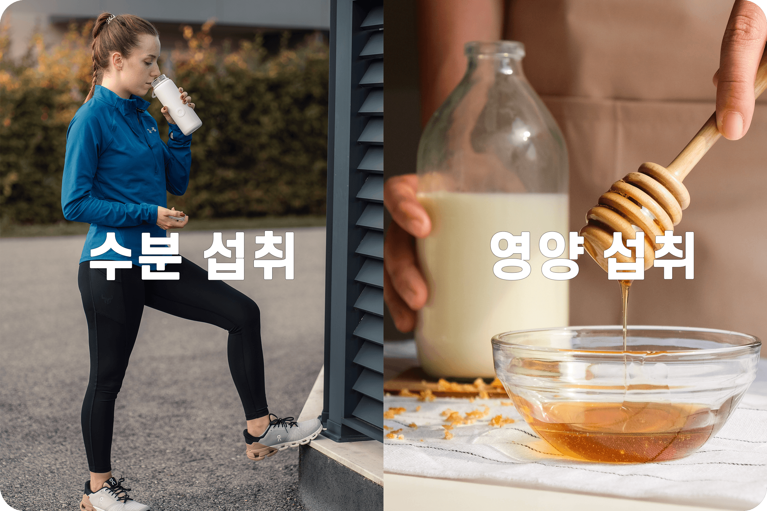 땀이 많은 종목 그리고 더운 시기에 훈련이나 경기를 한 후에는 충분한 수분 섭취가 필수입니다. 충분한 수분 섭취는 회복을 위한 영양소 공급을 원활하게 합니다. 하지만 한 번에 너무 많은 양의 수분을 섭취하게 되면, 신체의 체액 농도를 낮추어 근육의 수축을 억제할 수 있으니 여러 번에 걸쳐 수분 섭취를 하는 것이 좋습니다.