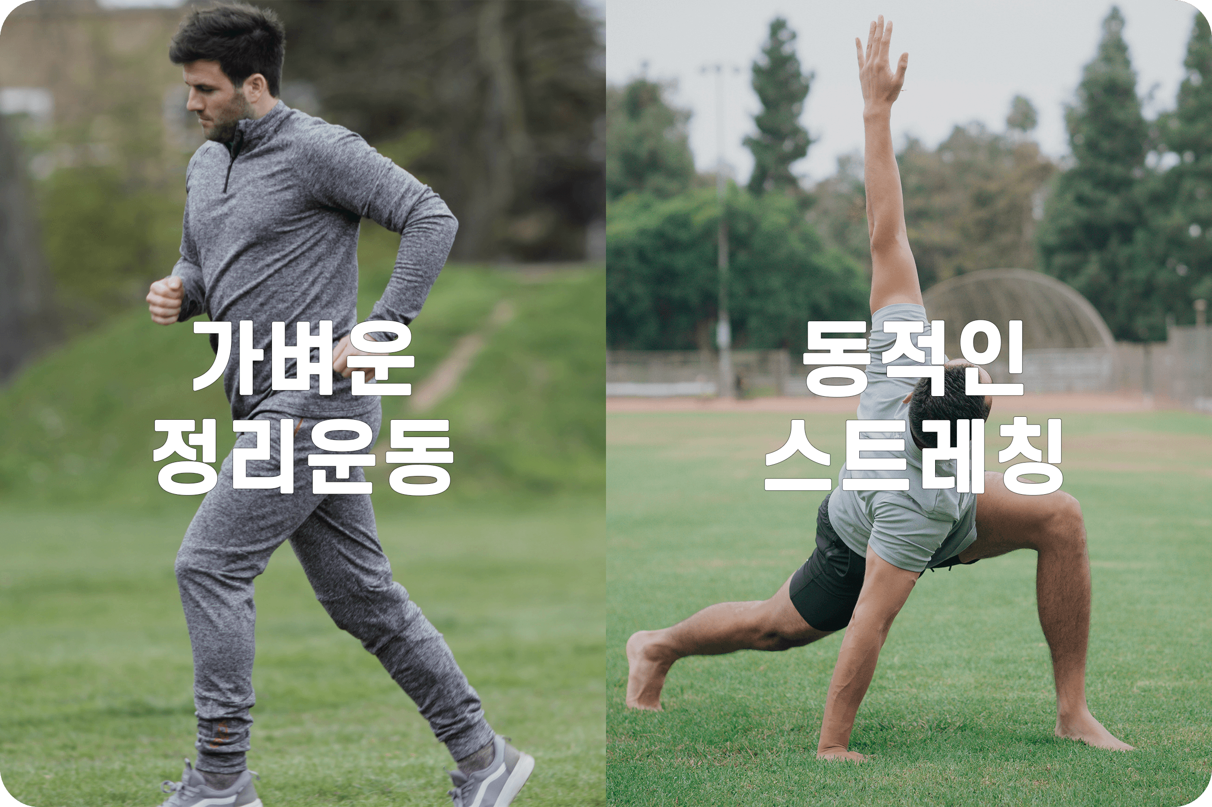 30~40%의 강도는 저강도 운동 강도에 속하는데, 이 정도 운동의 강도는 선수들의 높은 심박수를 안전하게 낮춰줍니다. 그리고 신체의 부담은 덜 하지만 호흡량은 유지가 되어 산소 공급을 원활하게 하여 회복을 촉진합니다. - 동적인 스트레칭을 진행합니다.