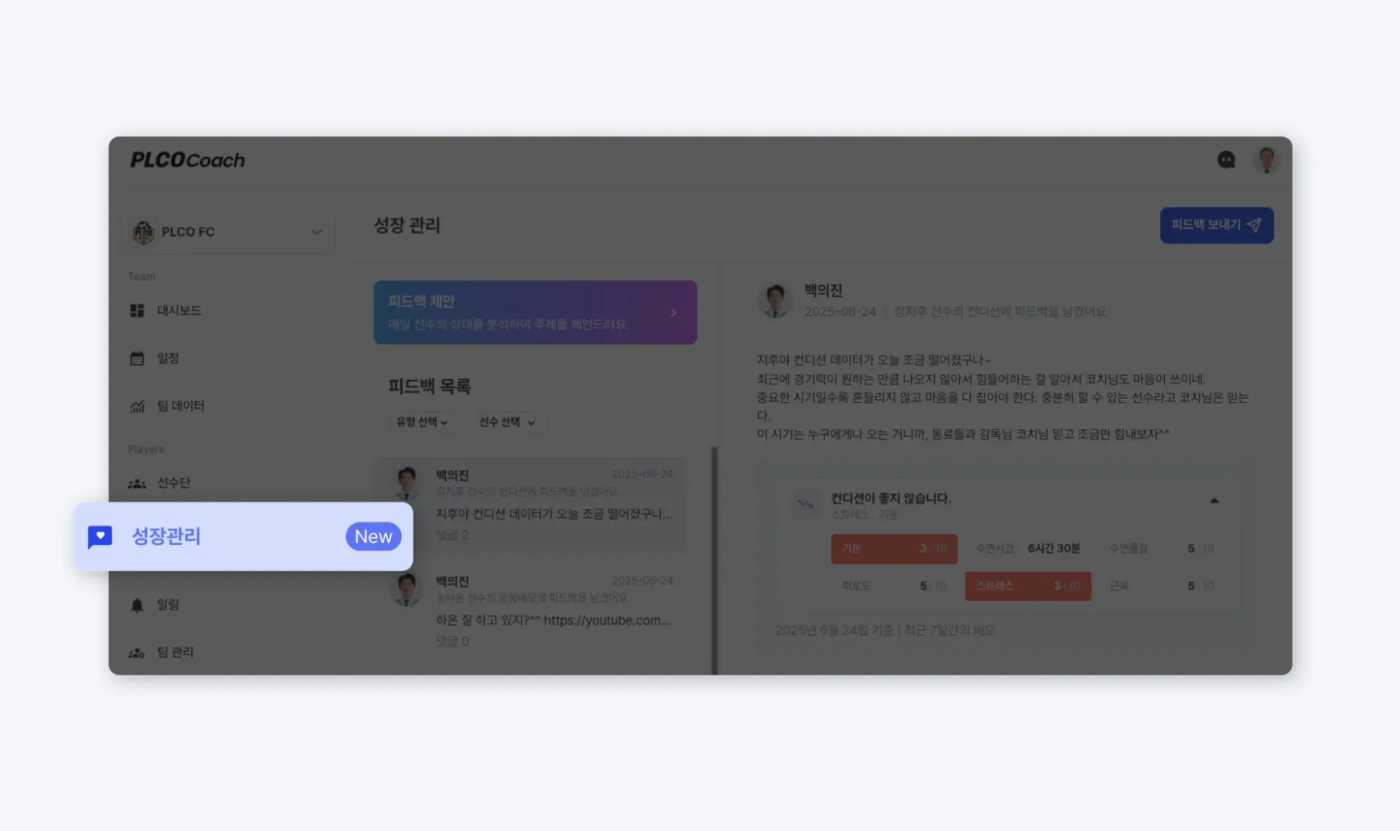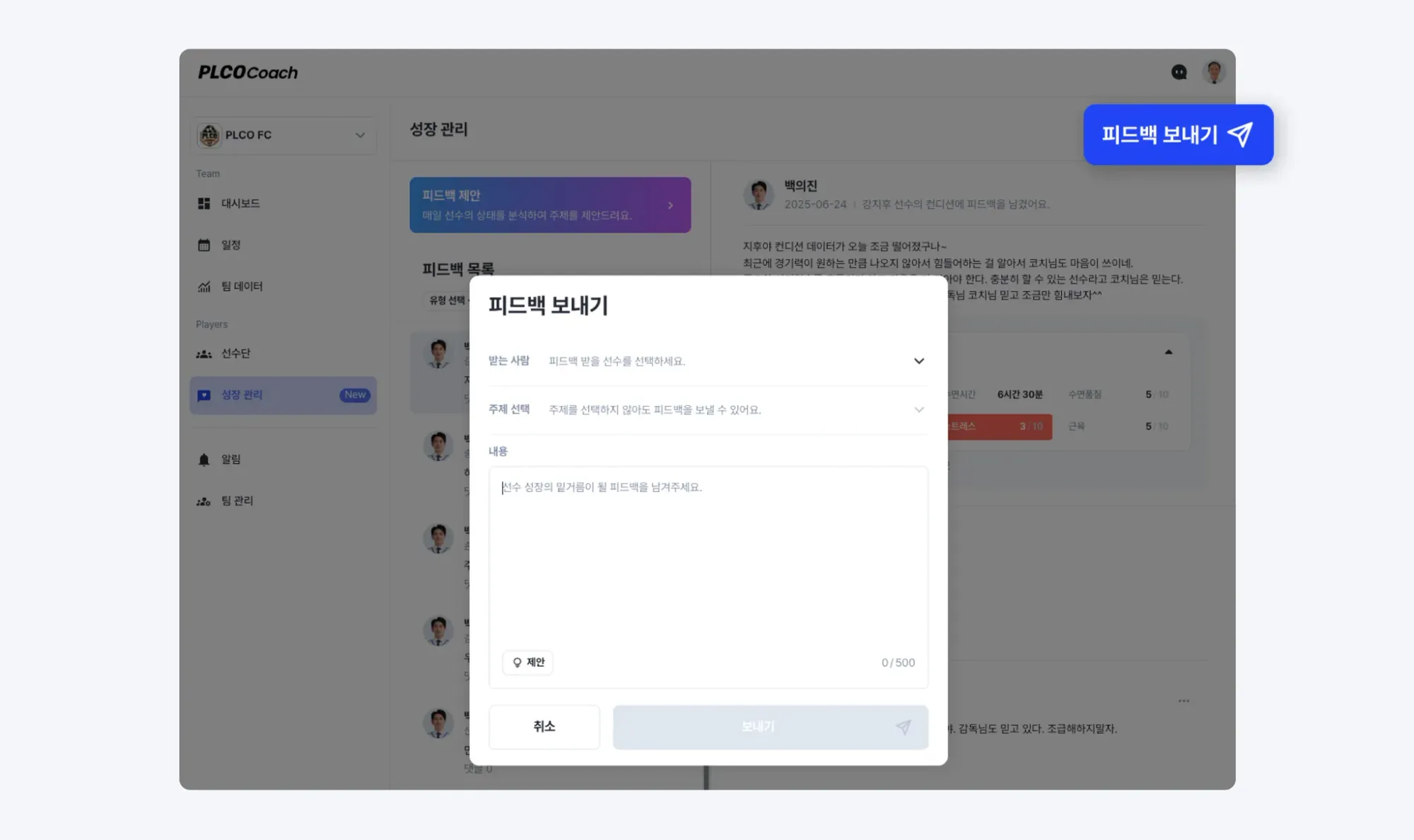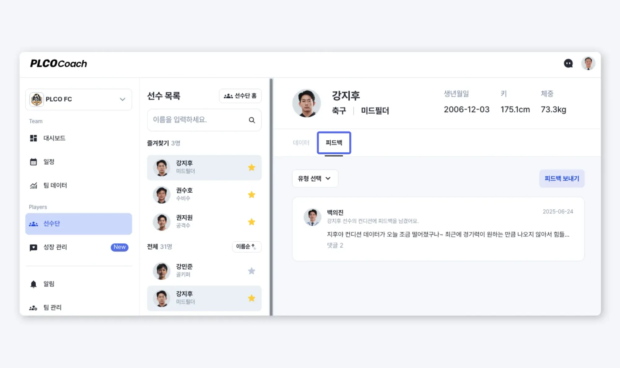 이곳에서 선수와 피드백을 주고받을 수 있고, 전체 피드백 확인도 가능합니다.