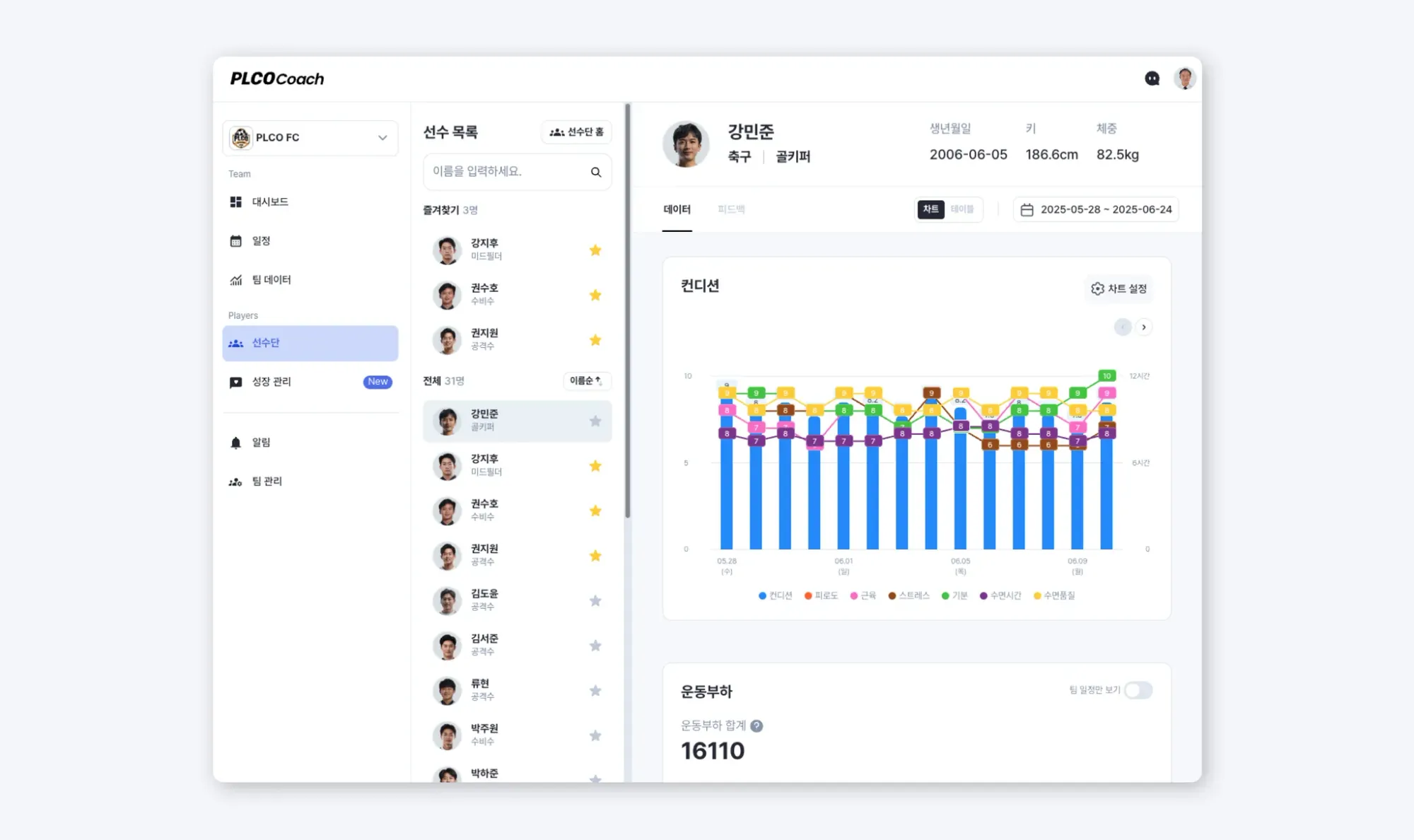 - 팀 데이터 > 개별 데이터 > 운동부하 탭