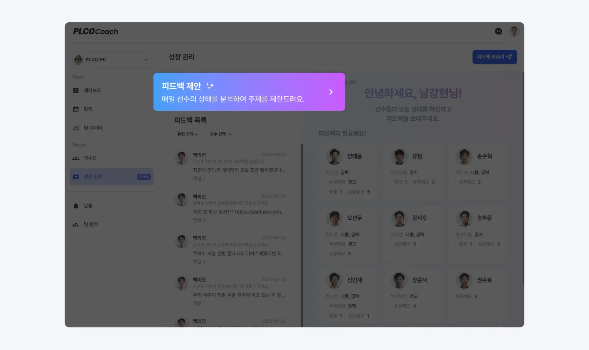 이제 선수의 운동 메모를 확인하고 바로 피드백을 보낼 수 있습니다.