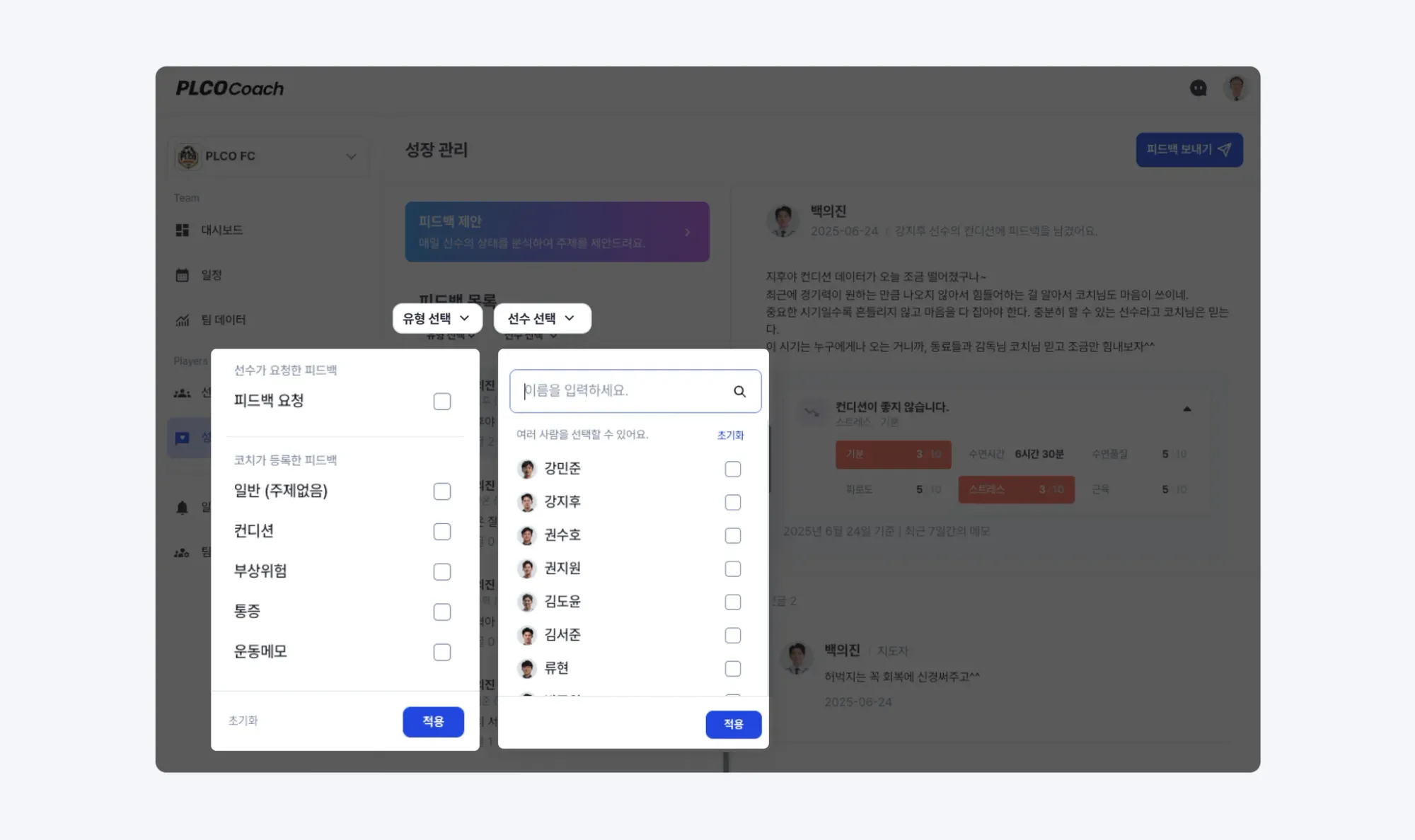 필터 기능을 활용해 피드백 유형 또는 특정 선수만 골라서 확인할 수 있습니다.