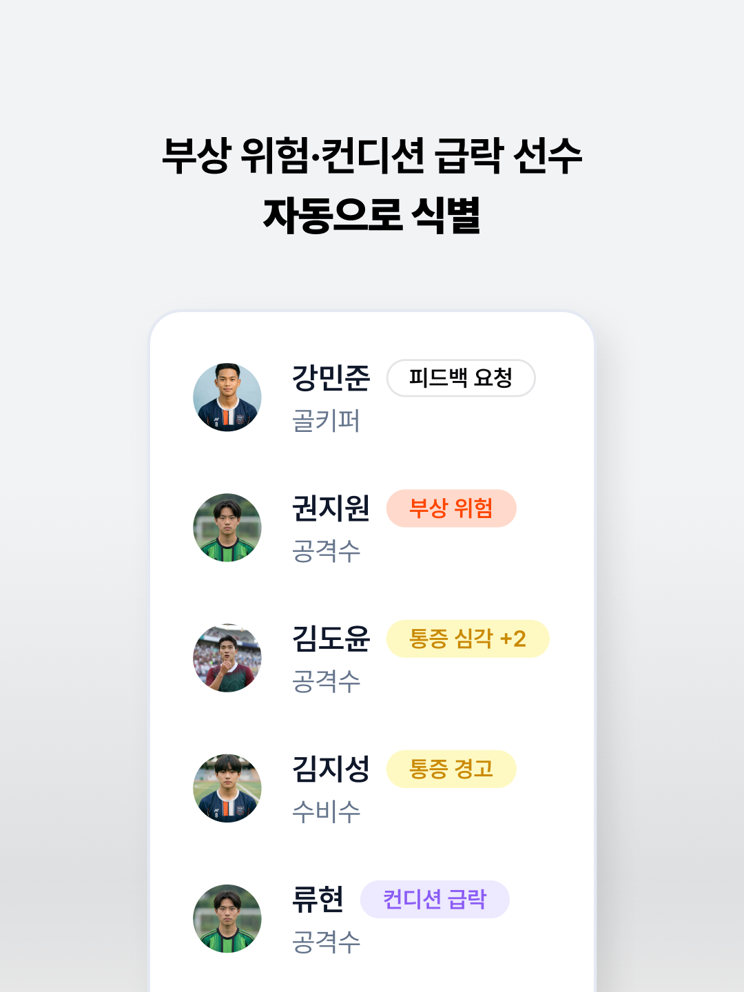 선수의 상태 태그(부상 위험·통증 심각·컨디션 급락·피드백 미확인 3일 이상)에 따라 즉각 대응이 필요한 선수가 목록 상단에 자동으로 정렬됩니다. 더 이상 선수 한 명 한 명의 피드백을 스크롤하며 확인할 필요가 없습니다. 여러 이슈가 겹친 선수도 카드 하나로 한눈에 파악할 수 있고, 추가 이슈가 있으면 +N으로 표시됩니다.
