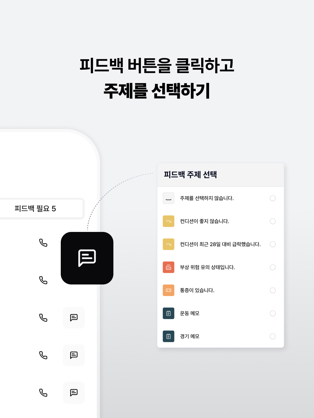 피드백 작성 전 주제를 먼저 선택할 수 있습니다. 컨디션·부상·통증·운동·경기 등 상황에 맞는 주제를 고르면, 코치와 선수 모두 피드백의 맥락을 한눈에 파악할 수 있습니다. 긴 설명 없이도 어떤 항목에 대한 피드백인지 명확하게 전달되기 때문에, 선수는 내용을 더 빠르게 이해하고 대응할 수 있습니다. 주제별로 피드백이 정리되면 누적 관리도 한결 수월해집니다.
