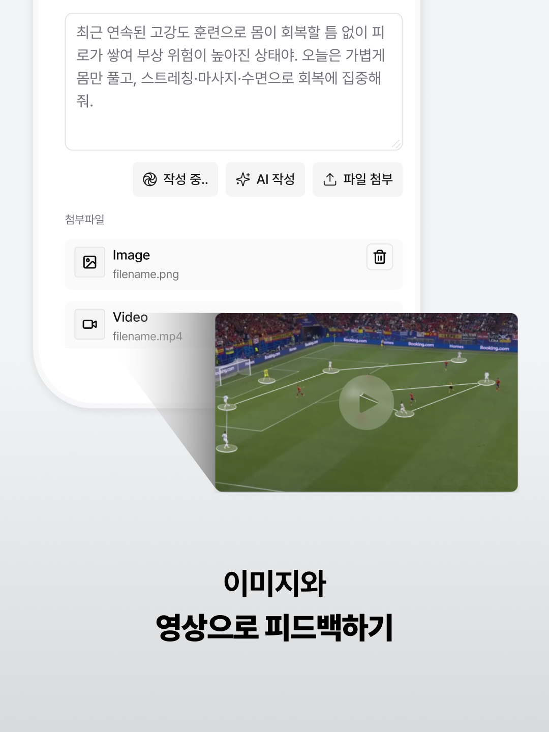 피드백 작성 화면의 '파일 첨부' 버튼에서 이제 영상 파일도 선택할 수 있습니다. 이미지와 영상을 함께 첨부하는 것도 가능하며, 첨부된 영상은 선수 앱에서 바로 재생됩니다. 선수는 받은 피드백에서 파일을 바로 확인하고, 어려운 부분이 있으면 댓글로 답변을 남길 수 있습니다.