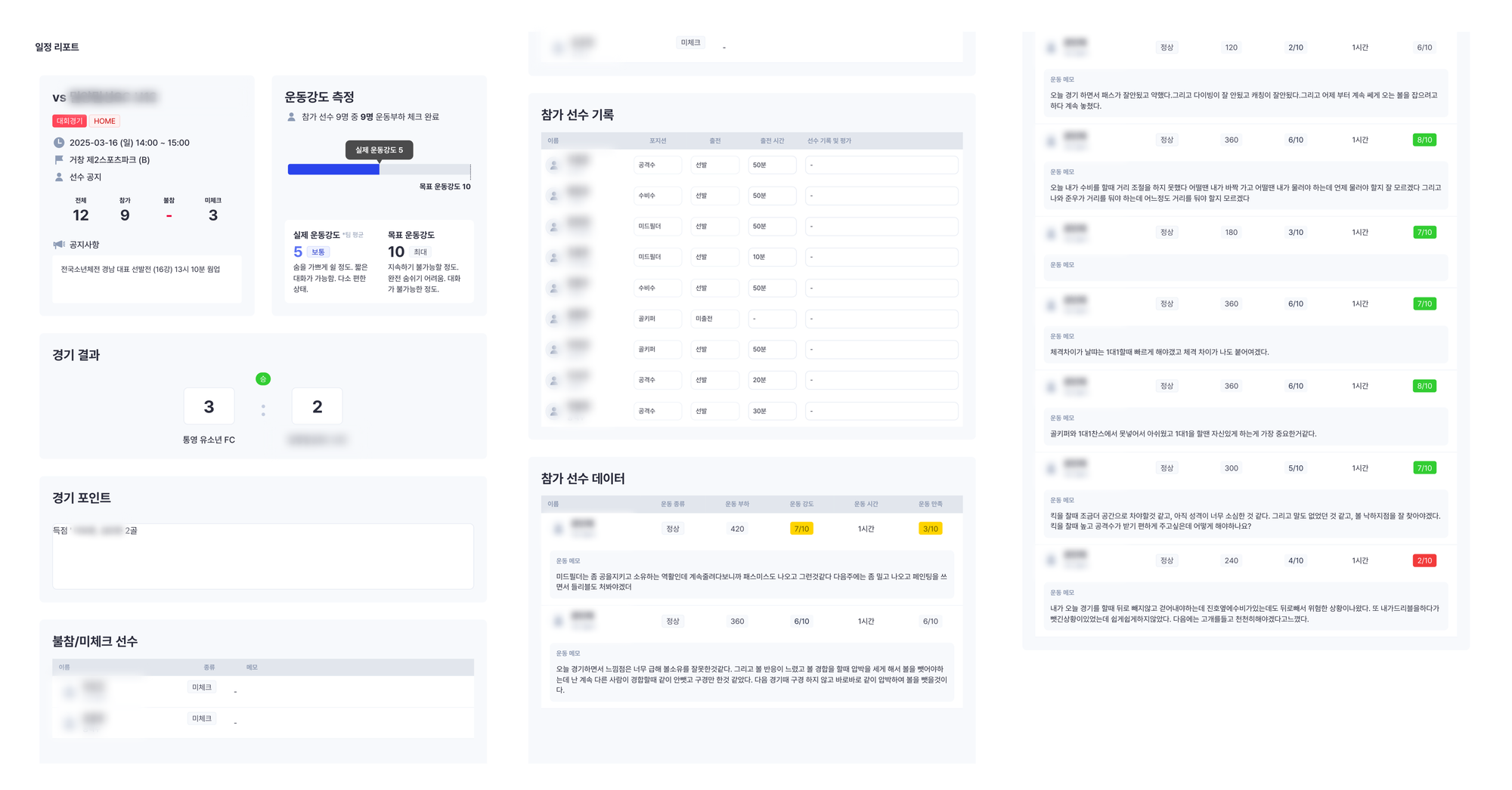또한, 리포트 안에서 선수들이 작성한 운동 메모를 한눈에 확인할 수 있다는 점이 특히 좋습니다. 아이들이 훈련 중 느꼈던 점이나 그 순간 해결하지 못했던 부분, 또는 지도자에게 바로 표현하기 어려웠던 생각들을 메모를 통해 솔직하게 남겨주는데, 이 내용을 꼭 확인해서 다음 훈련 계획에 반영하고 있습니다. 필요한 경우에는 이 메모 내용을 부모님께 공유해 선수의 상태나 고민을 함께 나누기도 합니다.
