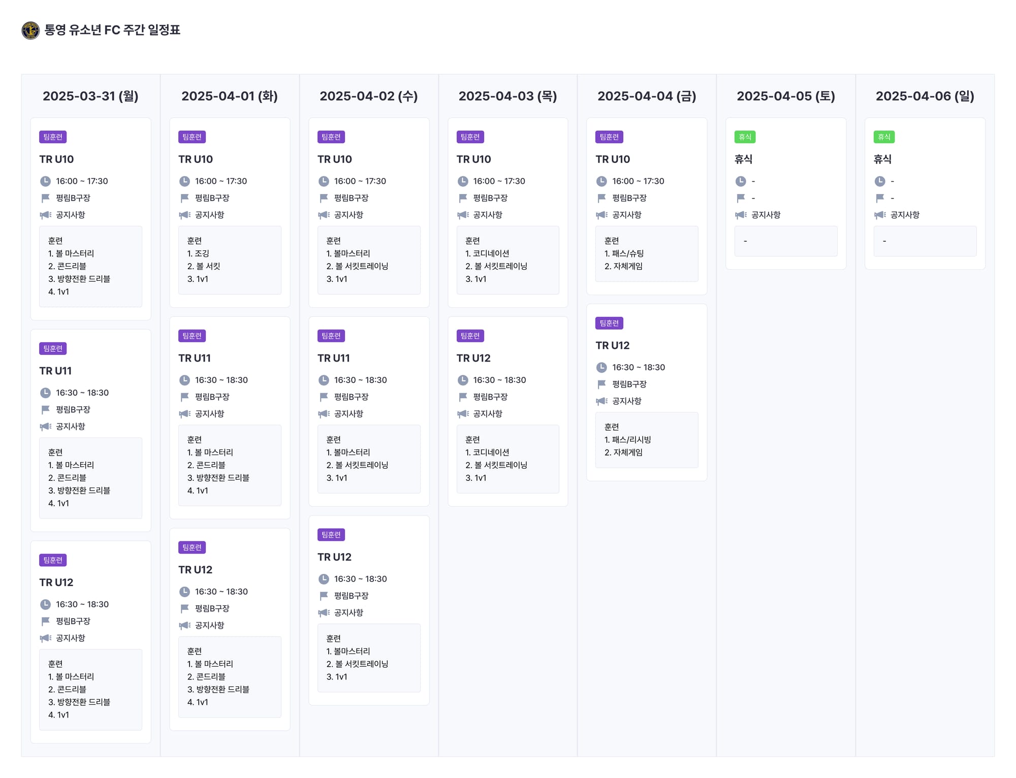 저희 통영유소년FC 지도자들은 경기나 훈련 일정을 계획하면 사전에 플코를 통해 선수들에게 공지하고 있습니다.