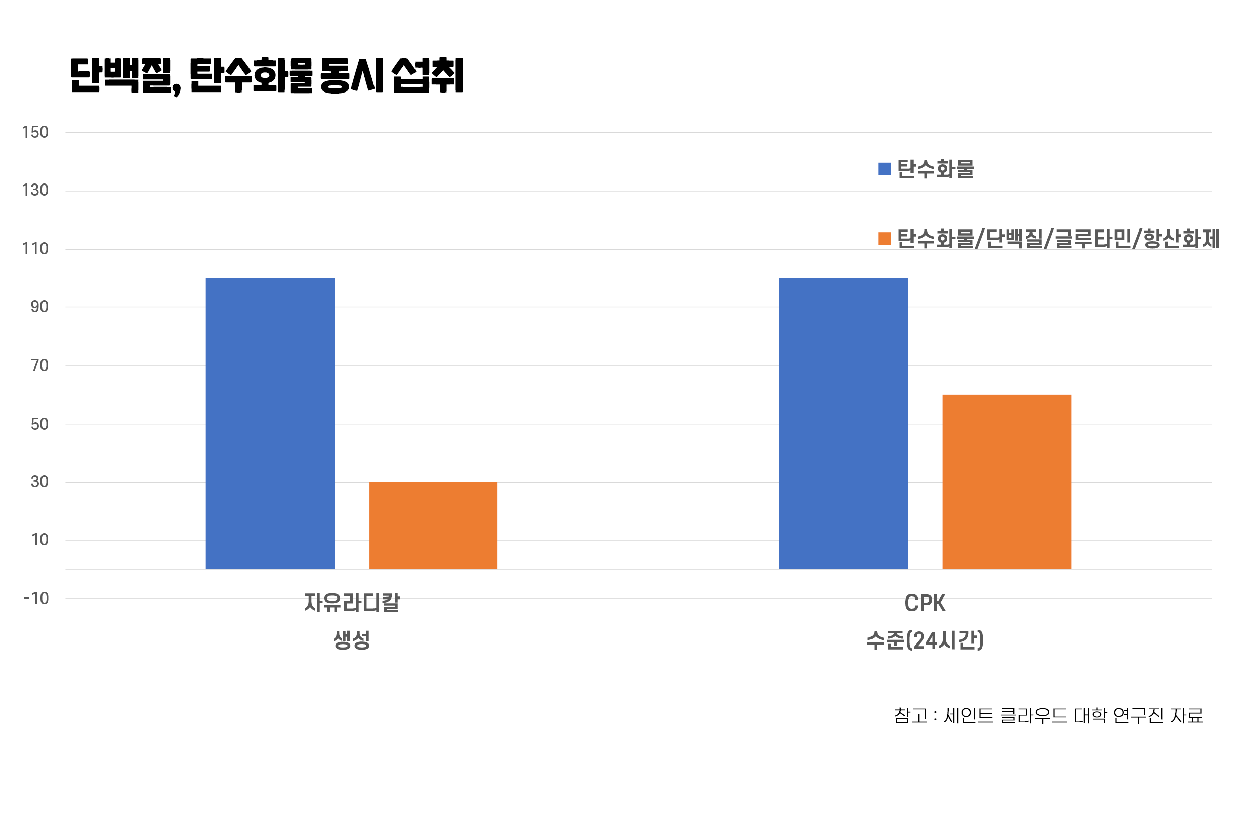 단순히 단백질만을 섭취하는 것이 아닌 탄수화물과 함께 섭취했을 때 운동 후 피로를 나타내는 지표인 자유 라디칼 및 CPK 수치가 감소함을 알 수 있습니다. 또한, Vanderbilt&미해병대 공동 연구진의 연구에 따르면, '탄수화물, 단백질의 섭취는 근단백질 합성을 강화하며, 근육 통증과 근육세포조직의 수분 유지 등에 긍정적인 효과가 있다'고 발표했습니다. 즉, 대부분의 운동선수들이 단백질 보충제에 더 많은 신경을 쓰고 있지만, 축구라는 종목 특성을 살펴볼 때 탄수화물 보충도 회복에 매우 중요하다는 것을 알 수 있습니다.