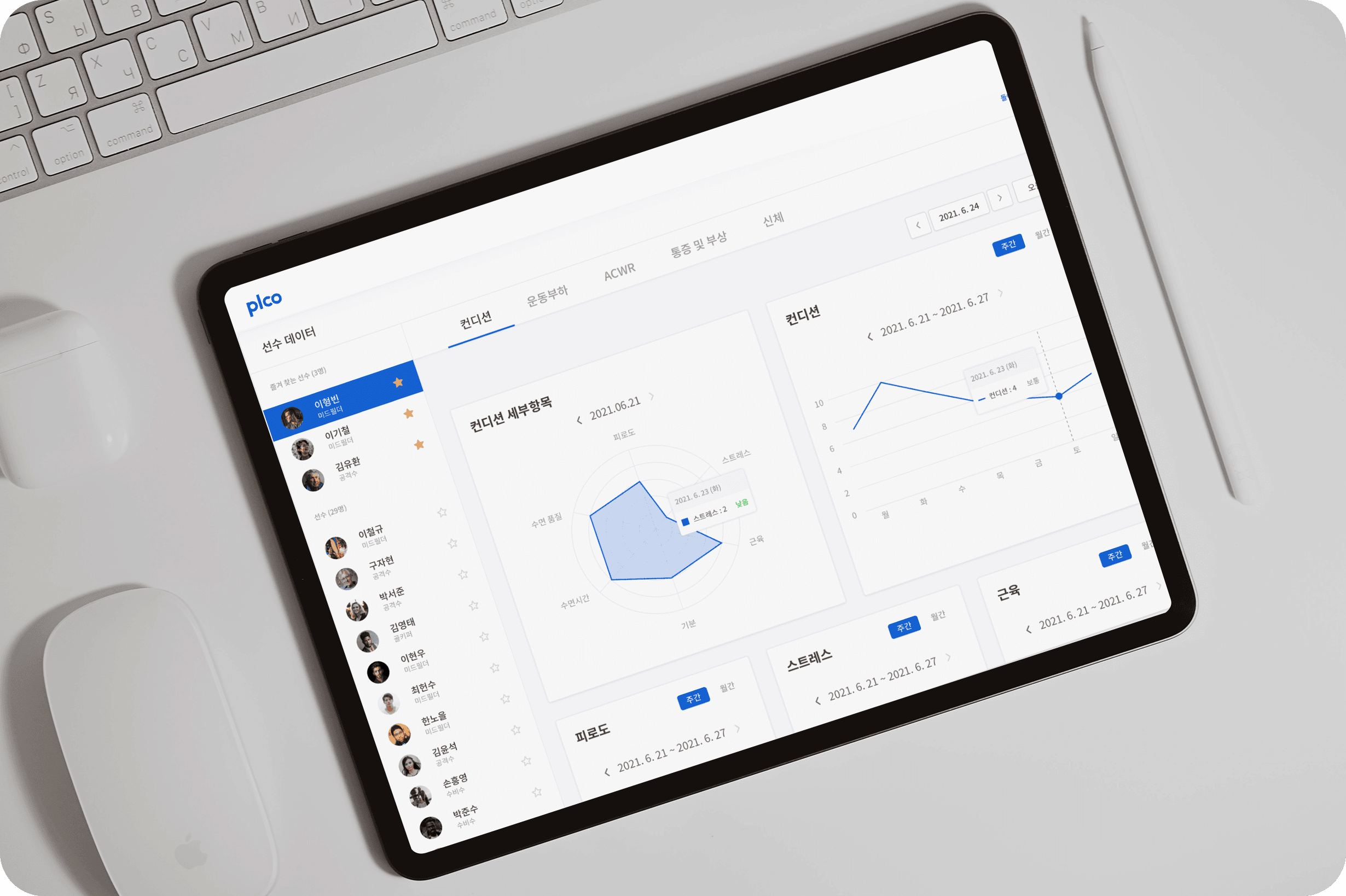 현장에서는 선수들의 오버트레이닝을 예방하기 위하여 다양한 방법으로 선수들의 피로도를 모니터링합니다. 젖산측정과 같이 순간적인 신체의 피로도를 측정하기도 하며, 심박수와 GPS등과 같은 다양한 도구들을 사용하여 활동량을 확인하여 피로를 관리하기도 합니다. 하지만 이러한 방법들은 선수들의 신체적 피로도만을 측정하기 때문에 선수들이 느끼는 부하와 차이가 있을 수 있습니다.