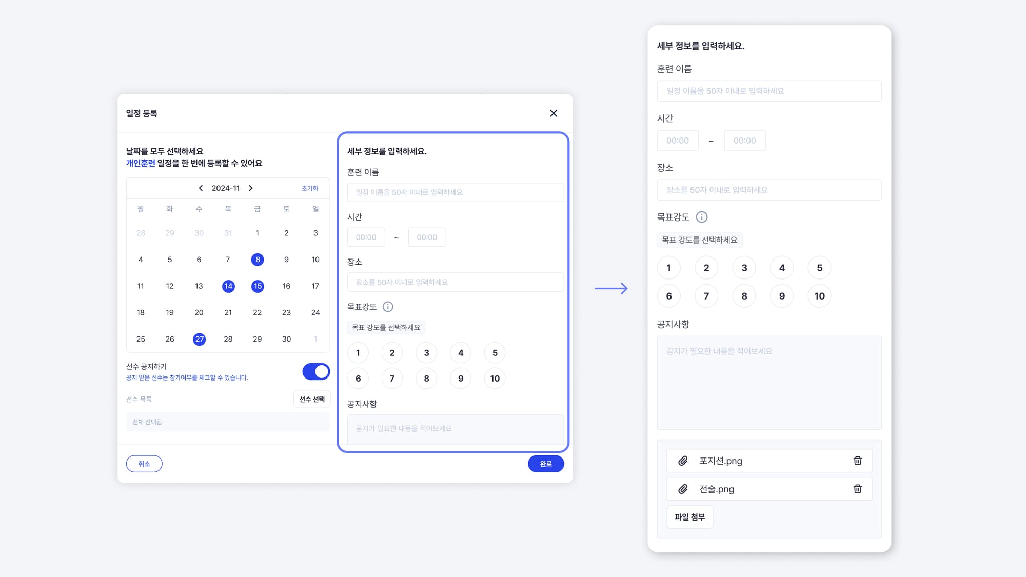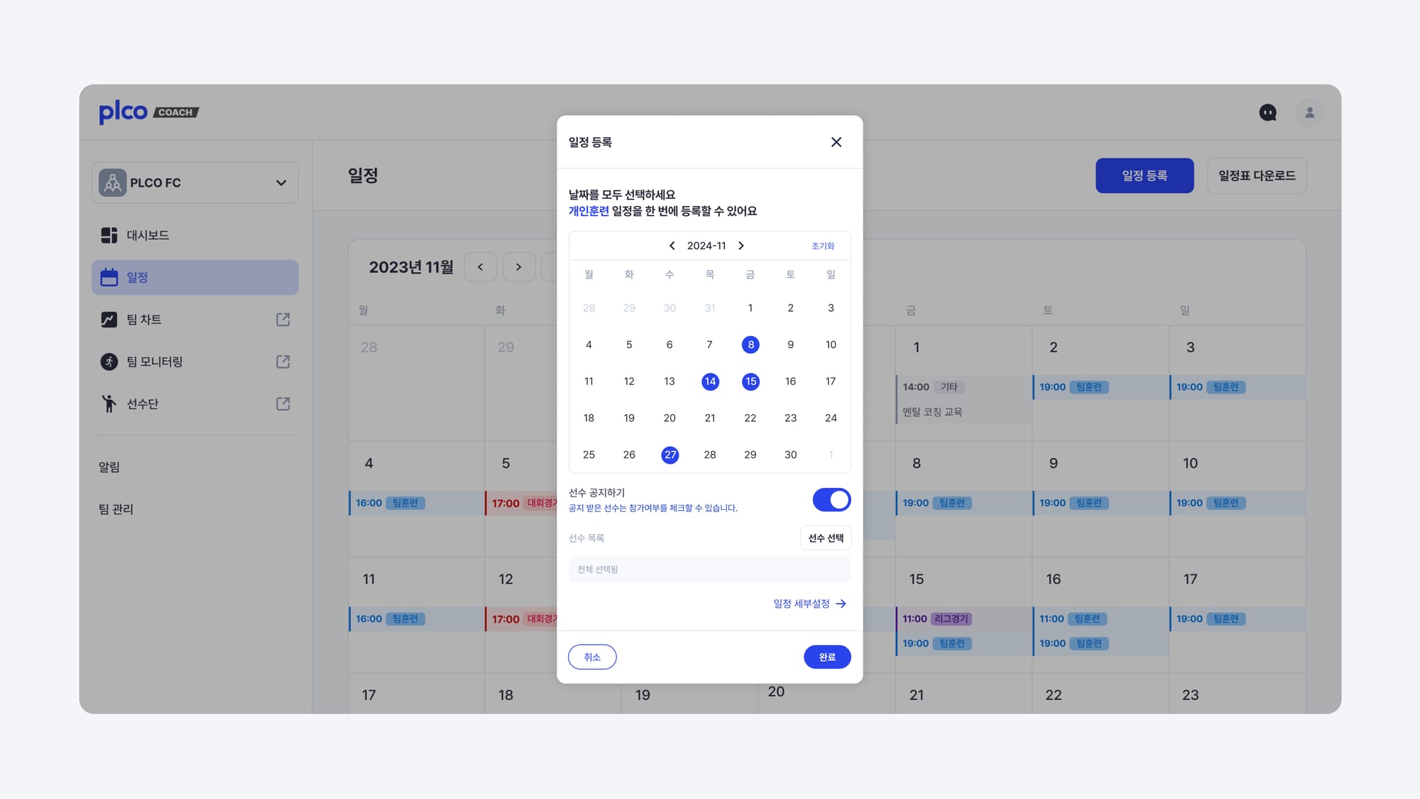 • ‘선수 공지하기’를 끄면 선수들에게 일정이 보여지지 않고, 관련 알림도 발송되지 않습니다.