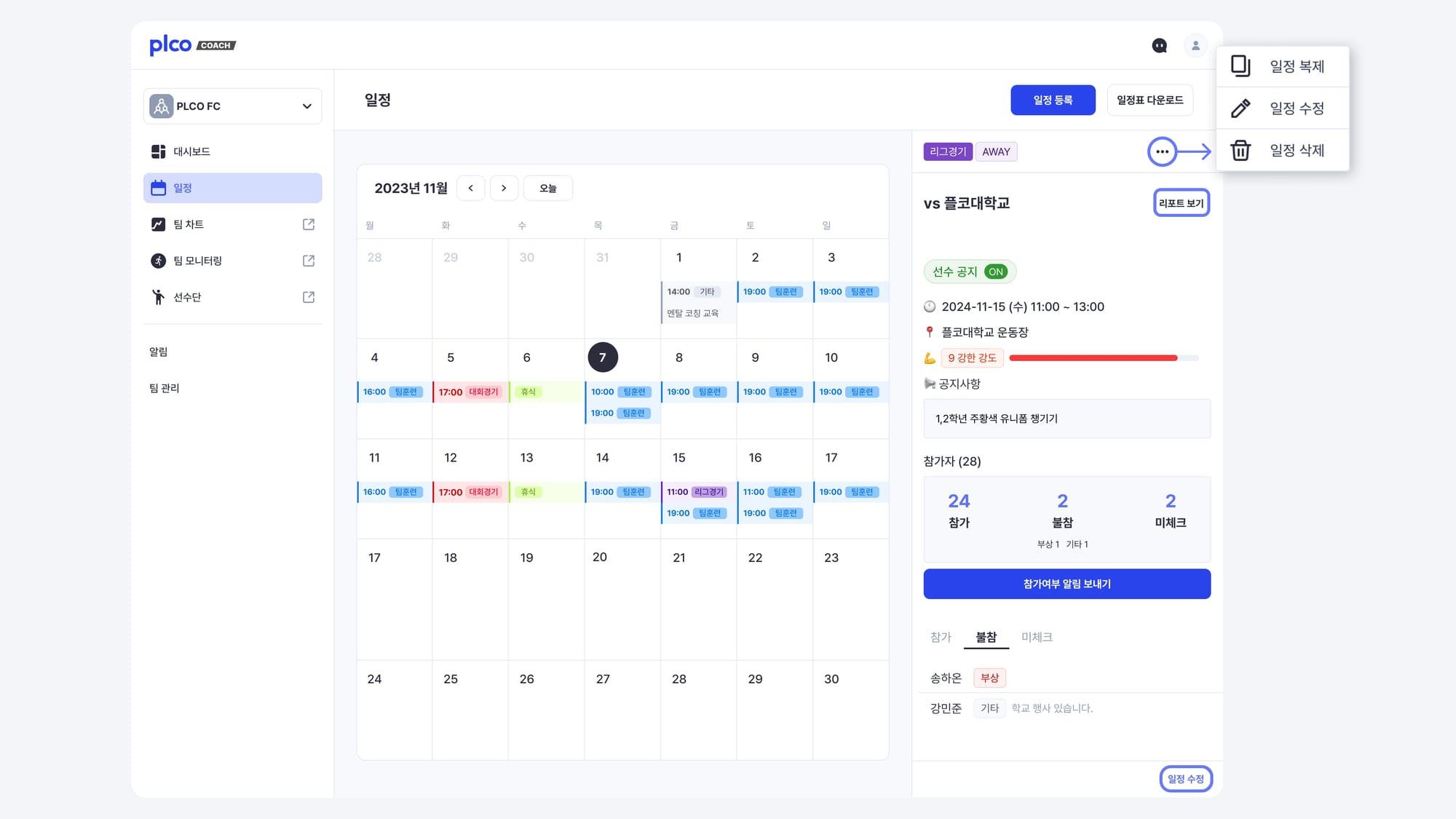 • 훈련을 포함한 모든 타입이 선수의 참가 여부 체크를 통해 참/불참 명단을 확인할 수 있습니다.