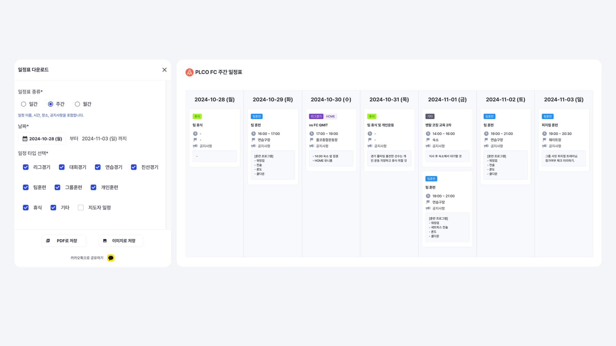 • 일정표를 이미지/PDF로 저장 혹은 카카오톡으로 공유할 수 있습니다. (이미지 예시 - 주간 일정표)