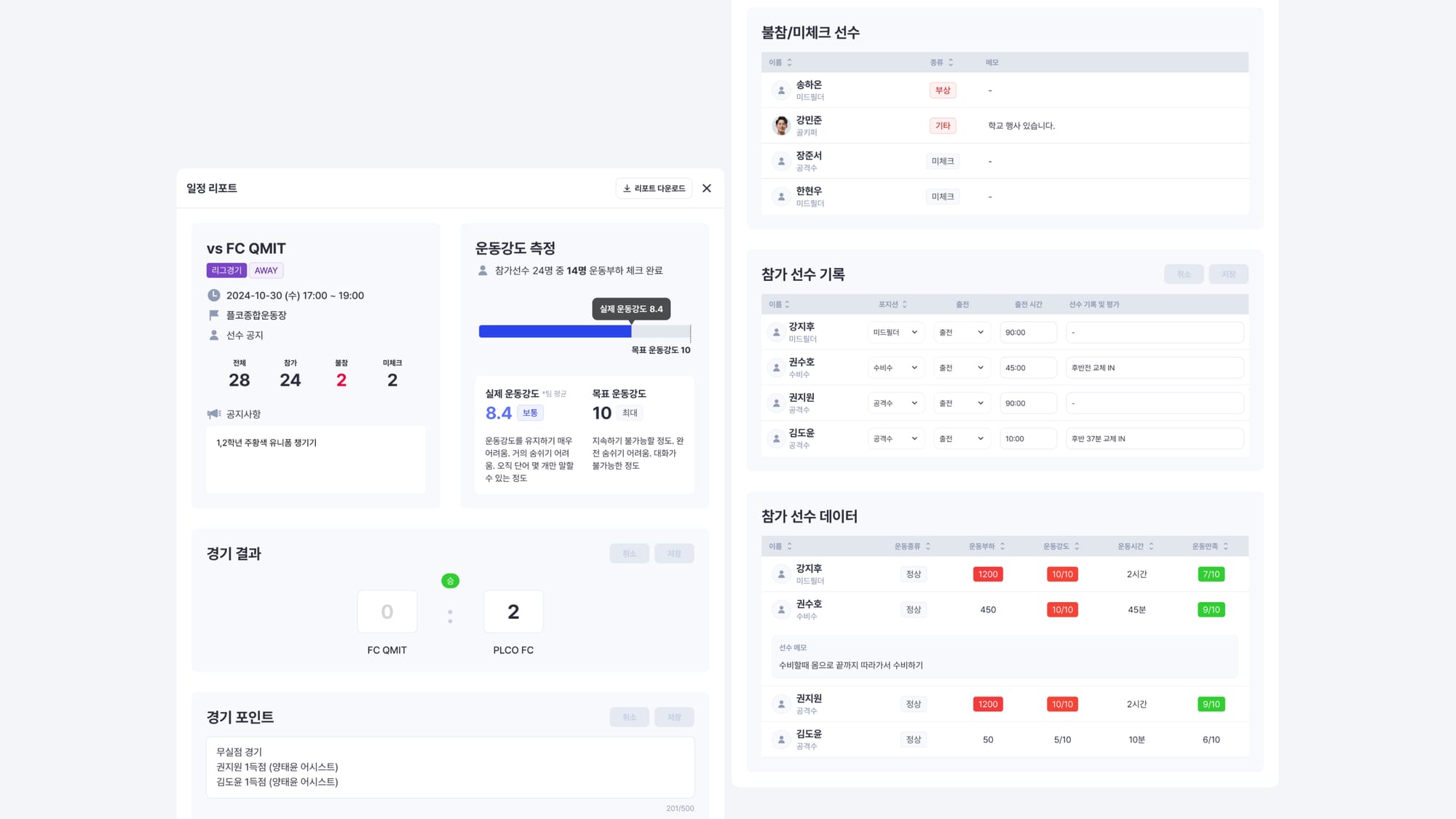 • 이제 경기 리포트에서 출전 여부를 등록하지 않아도, 일정에 참가로 체크한 선수의 데이터를 모두 확인할 수 있습니다.