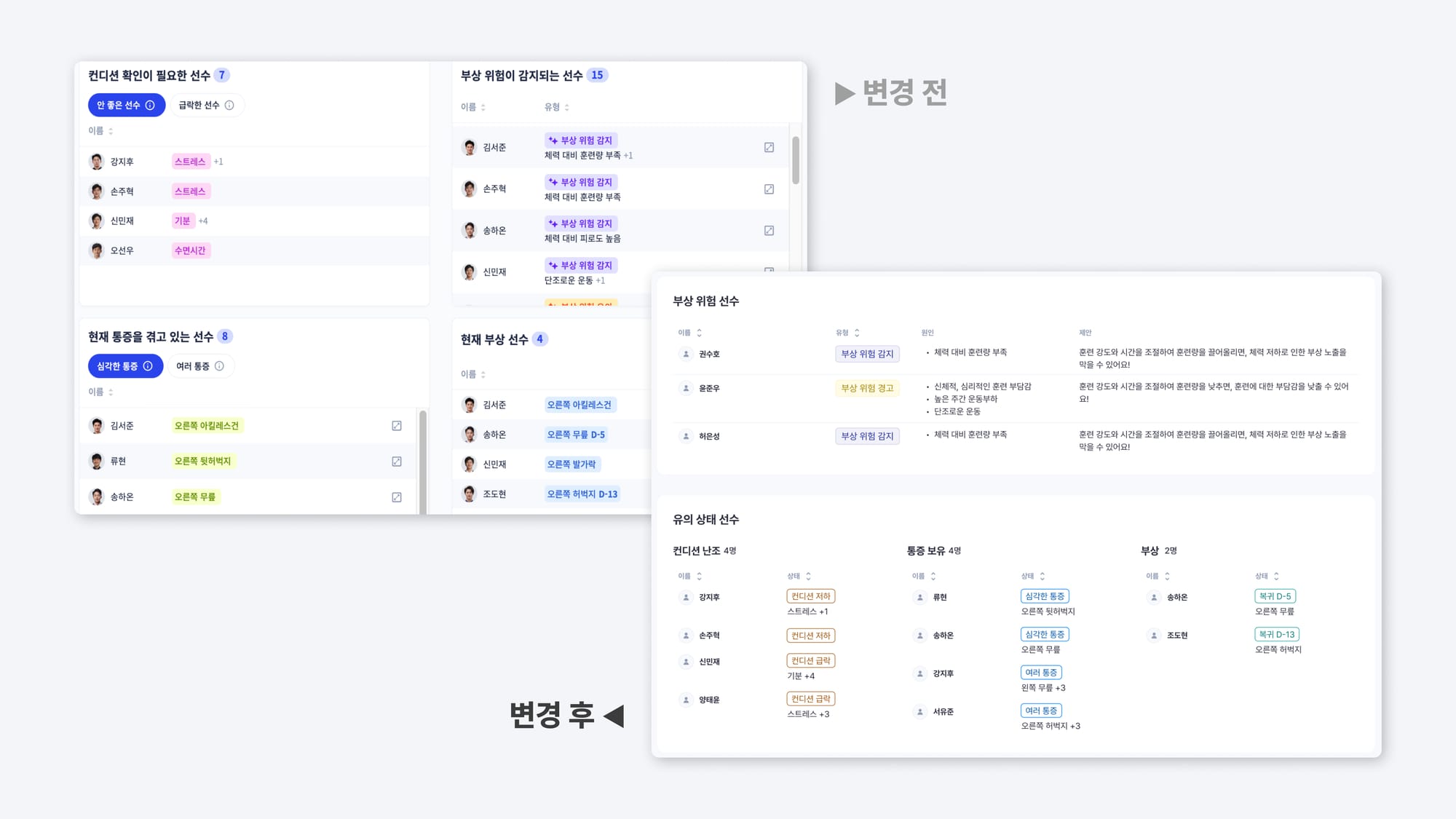 기존에 탭으로 구분했던 상태를 태그로 구분하여, 버튼을 누르지 않아도 한 화면에서 특이사항이 있는 선수들을 한번에 확인할 수 있습니다.