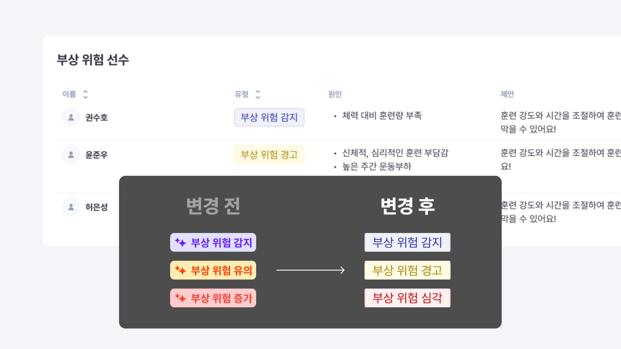• 툴팁을 누르지 않아도 부상 위험 선수의 목록과 원인, 제안 내용을 한눈에 확인할 수 있습니다.