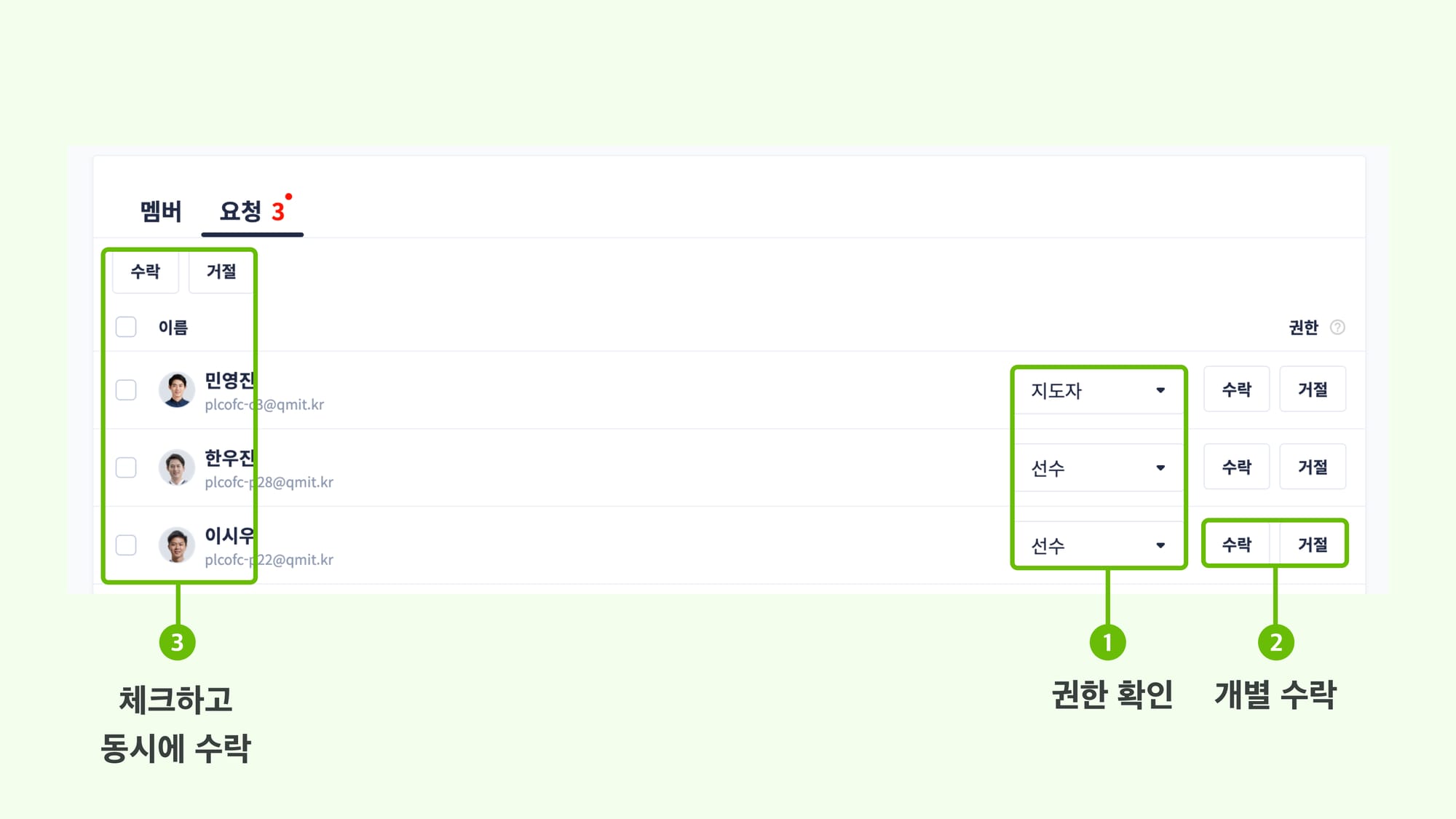 이후 한명씩 개별 수락을 하거나 체크박스를 이용해서 여러명을 수락할 수도 있어요.