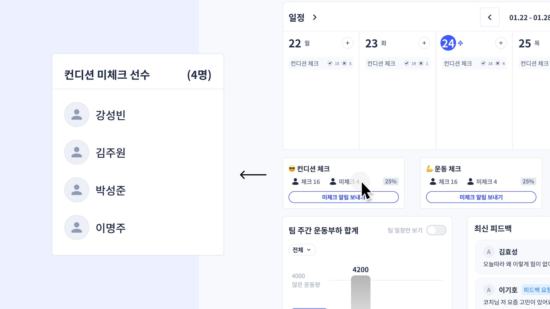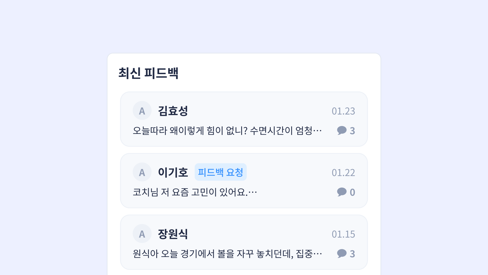 대시보드에서는 피드백을 20개까지 확인할 수 있고, 전체 내역은 알림함 또는 선수단 페이지에서 확인할 수 있어요.