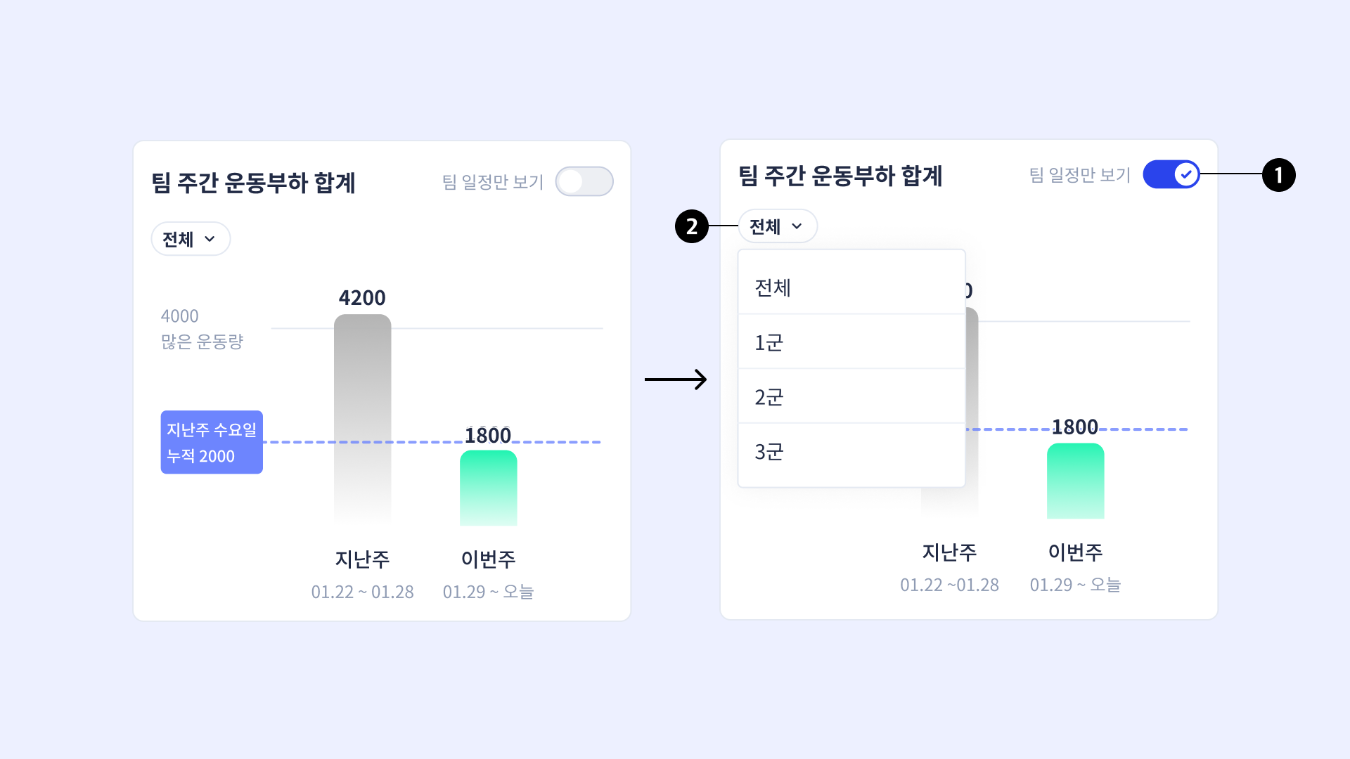① [팀 일정만 보기]를 선택하면, 팀 일정에 해당하는 주간 운동부하 합계를 비교할 수 있어요.