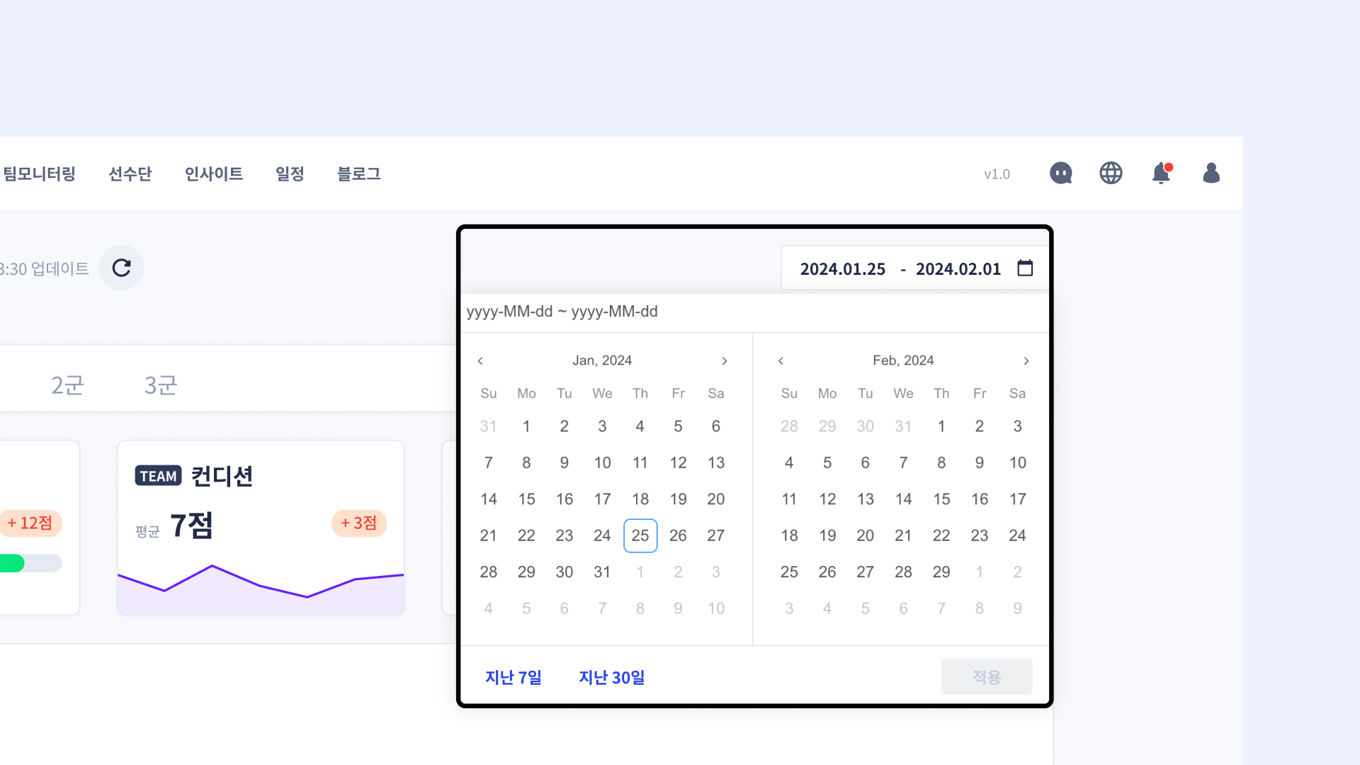 팀 차트와 선수단 페이지에서 원하는 날짜 범위로 데이터를 조회할 수 있어요.