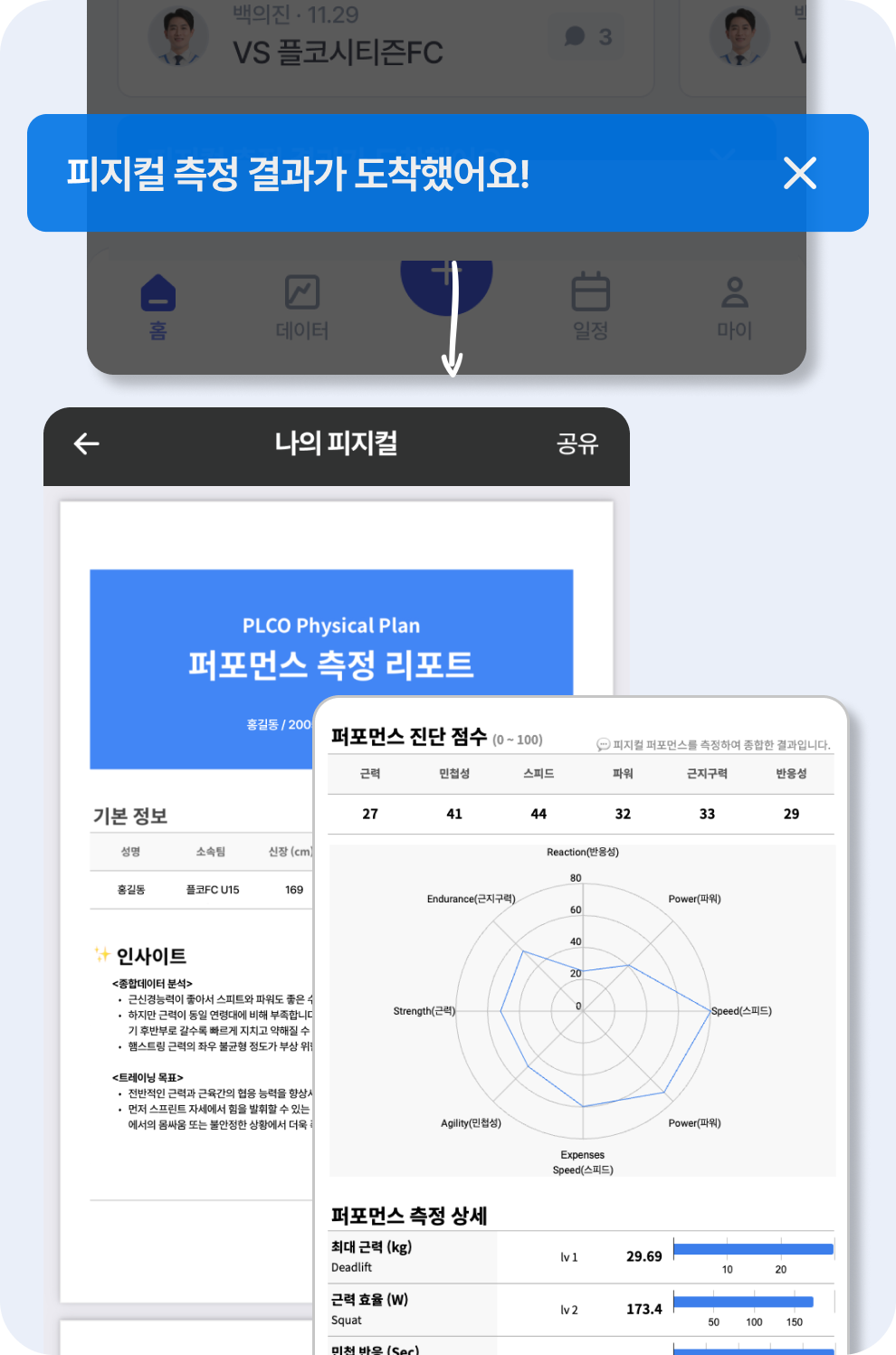 측정 리포트와 플코 추천 트레이닝 영상을 확인할 수 있습니다.
