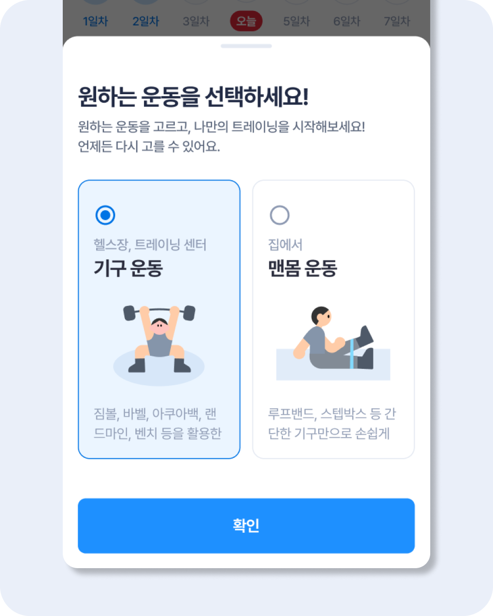 단, 오늘의 트레이닝을 모두 완료한 상태라면 다음날부터 운동 유형을 변경할 수 있습니다. -
