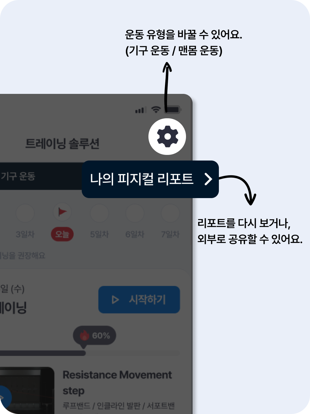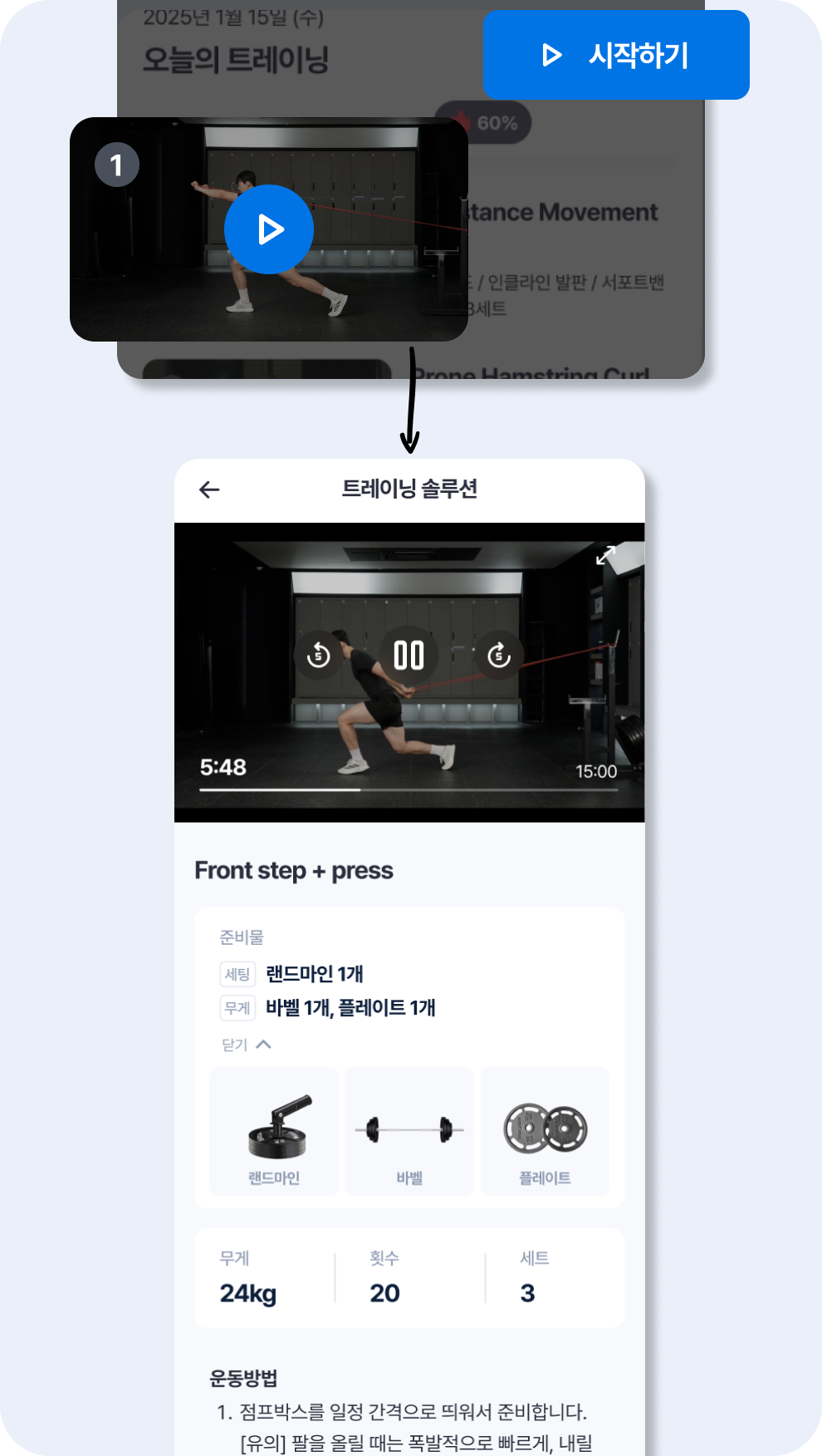 - 개별 트레이닝 영상을 누르면, 나의 피지컬 수준에 맞는 무게, 횟수, 세트수를 확인할 수 있습니다.