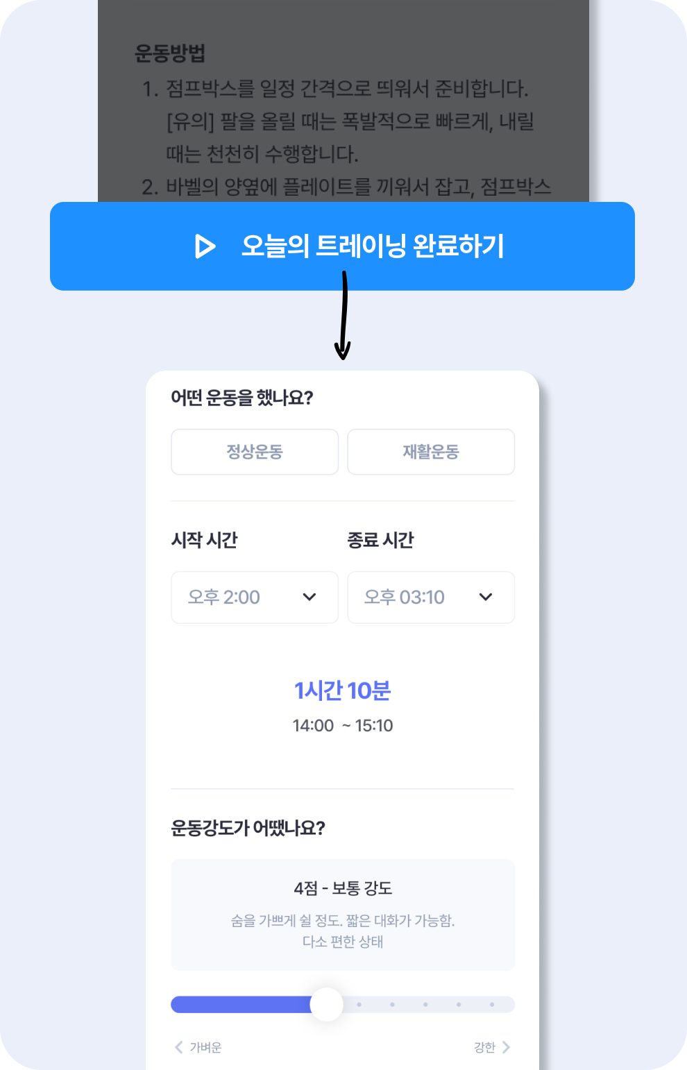 운동 시간, 강도, 메모 등을 체크해서 운동부하를 관리해 보세요!